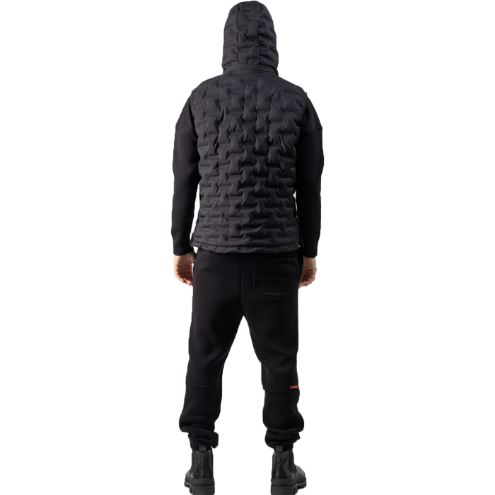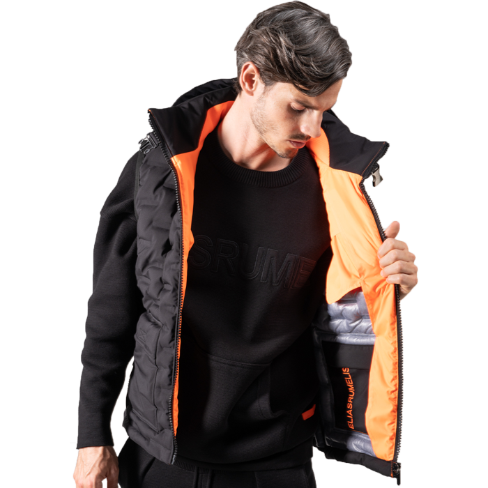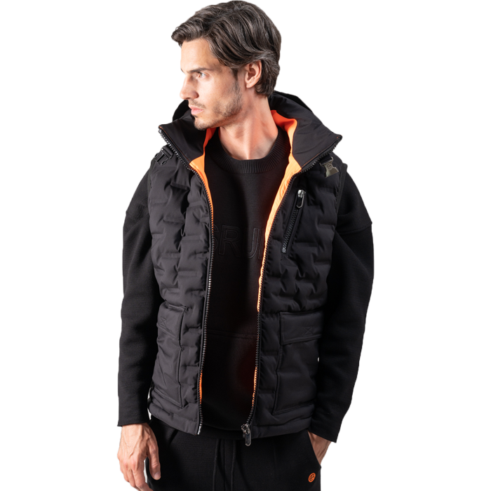 Die Weste EDMOND ist viel mehr als nur eine schwarz gesteppte Weste. Durch ihre besonderen orangenen Details sowohl innen als auch außen an den Seitentaschen, und auch die silberne Schnalle am Kragen, ist sie ein toller Hingucker. Dazu kommt die praktische und abnehmbare Kapuze.