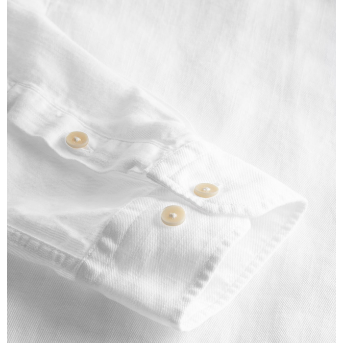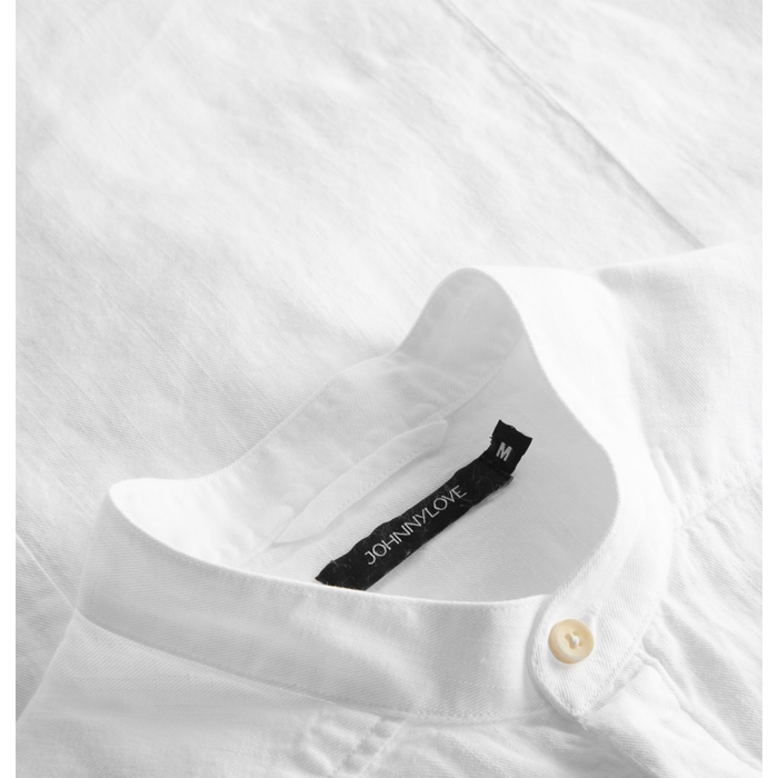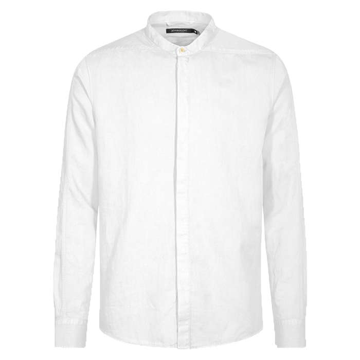 Stehkragenhemd mit einer frontal versteckten Knopfleiste. Das strukturierte Leinen-Baumwollgewebe ist luftig und dadurch kühlend.